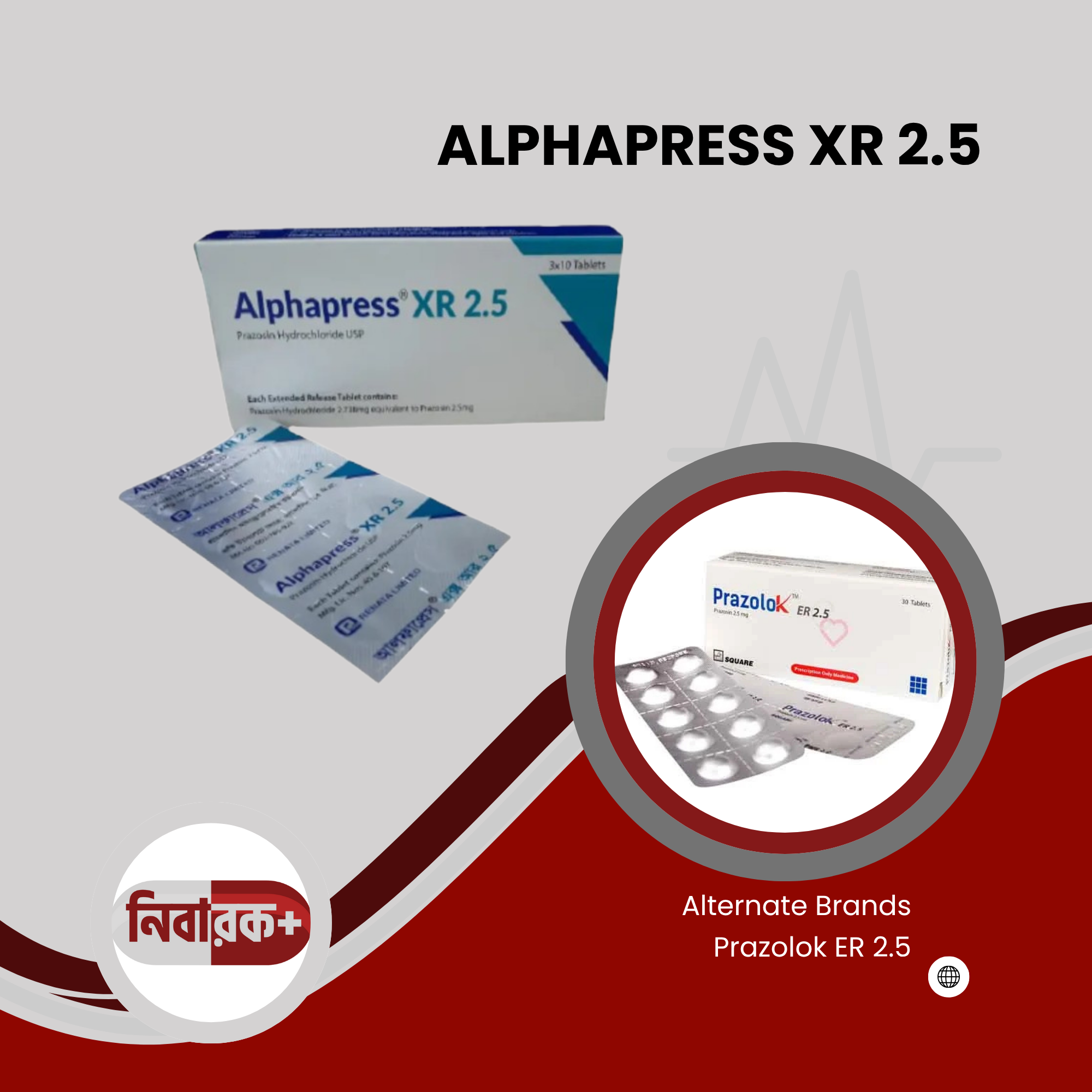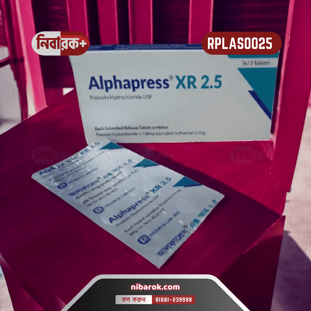 Alphapress XR 2.5 is an extended-release tablet containing Prazosin Hydrochloride 2.5 mg, manufactured by Renata Pharma Ltd. It is primarily prescribed for hypertension, Raynaud’s phenomenon, congestive heart failure, and benign prostatic hyperplasia.