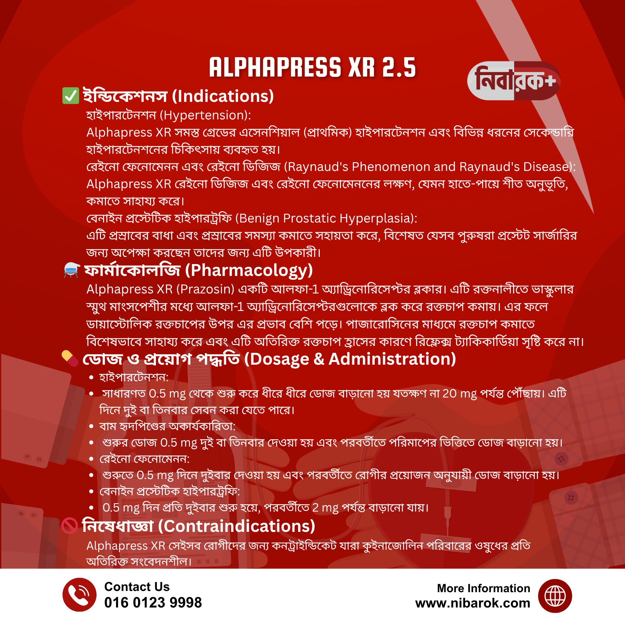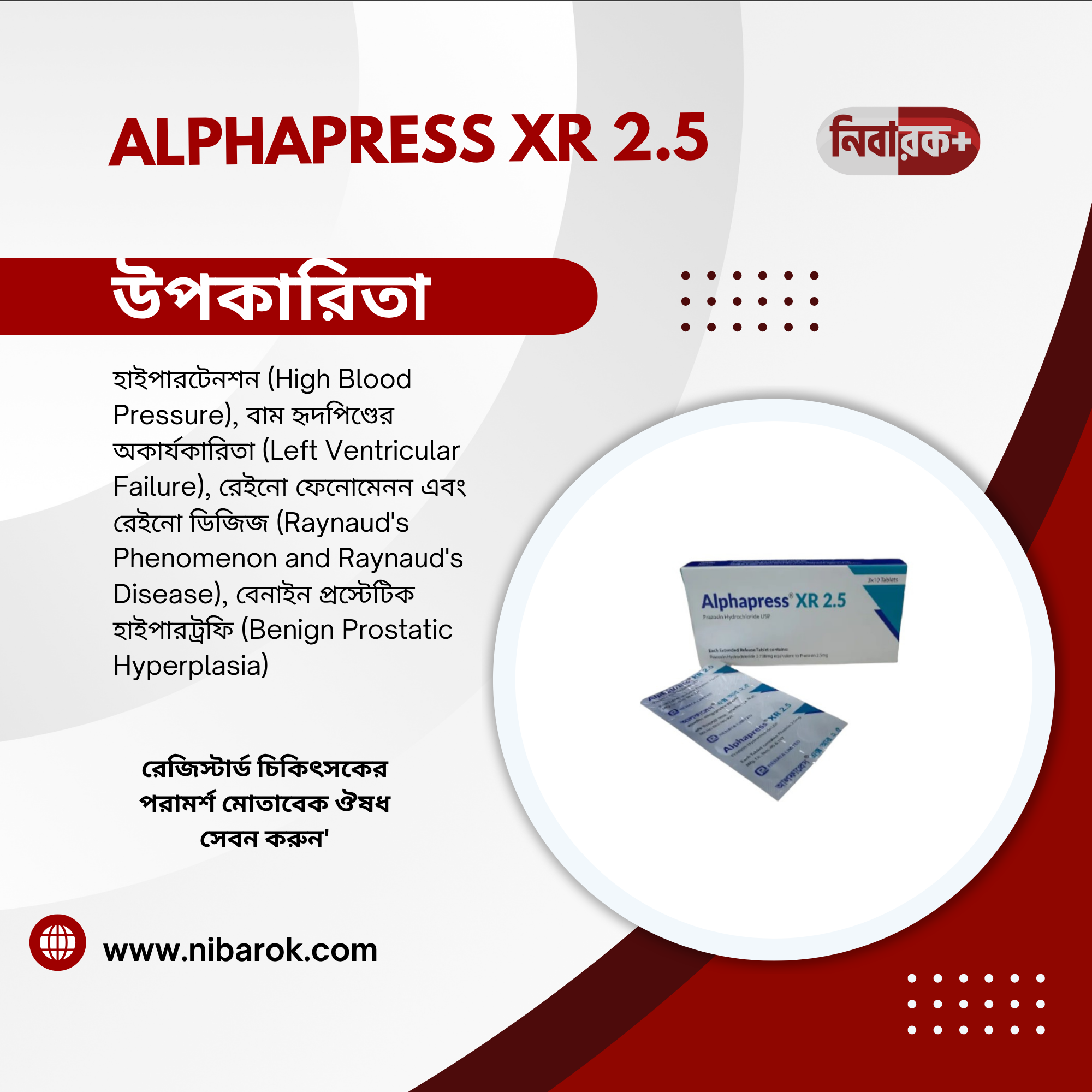 Alphapress XR 2.5 is indicated for the treatment of hypertension, Raynaud’s disease, congestive heart failure, and benign prostatic hyperplasia.