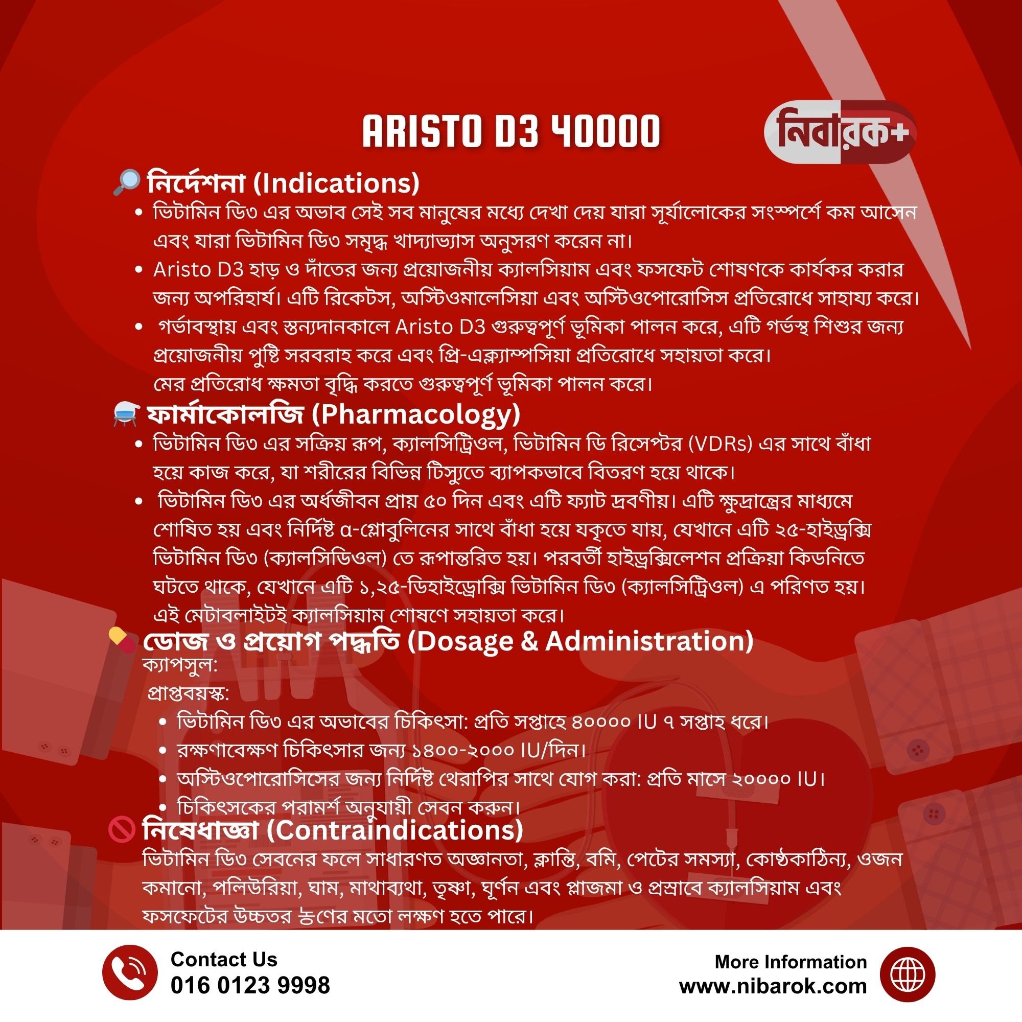 Looking for a powerful solution to support your bones and correct Vitamin D deficiency? ARISTO D3 40000 provides high-potency Vitamin D3 (40,000 IU) to help improve calcium absorption, boost bone density, and prevent fractures. Ideal for osteoporosis management and pregnancy support. Take control of your bone health with ARISTO D3 40000 today!