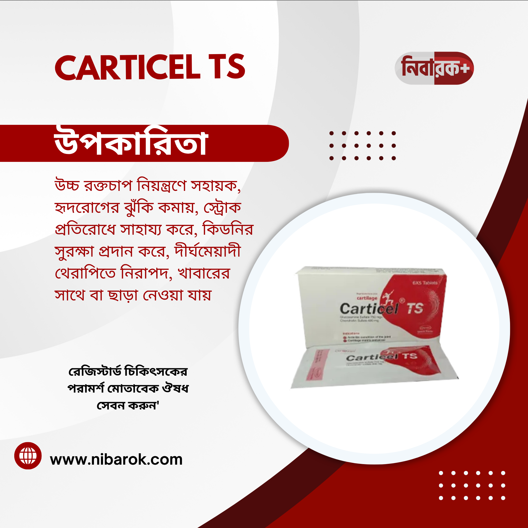 Description: Carticel TS is a combination therapy containing Glucosamine and Chondroitin, which are commonly used to manage symptoms of osteoarthritis. It helps in rebuilding cartilage and restoring the natural function of joints, thereby improving mobility and reducing pain.